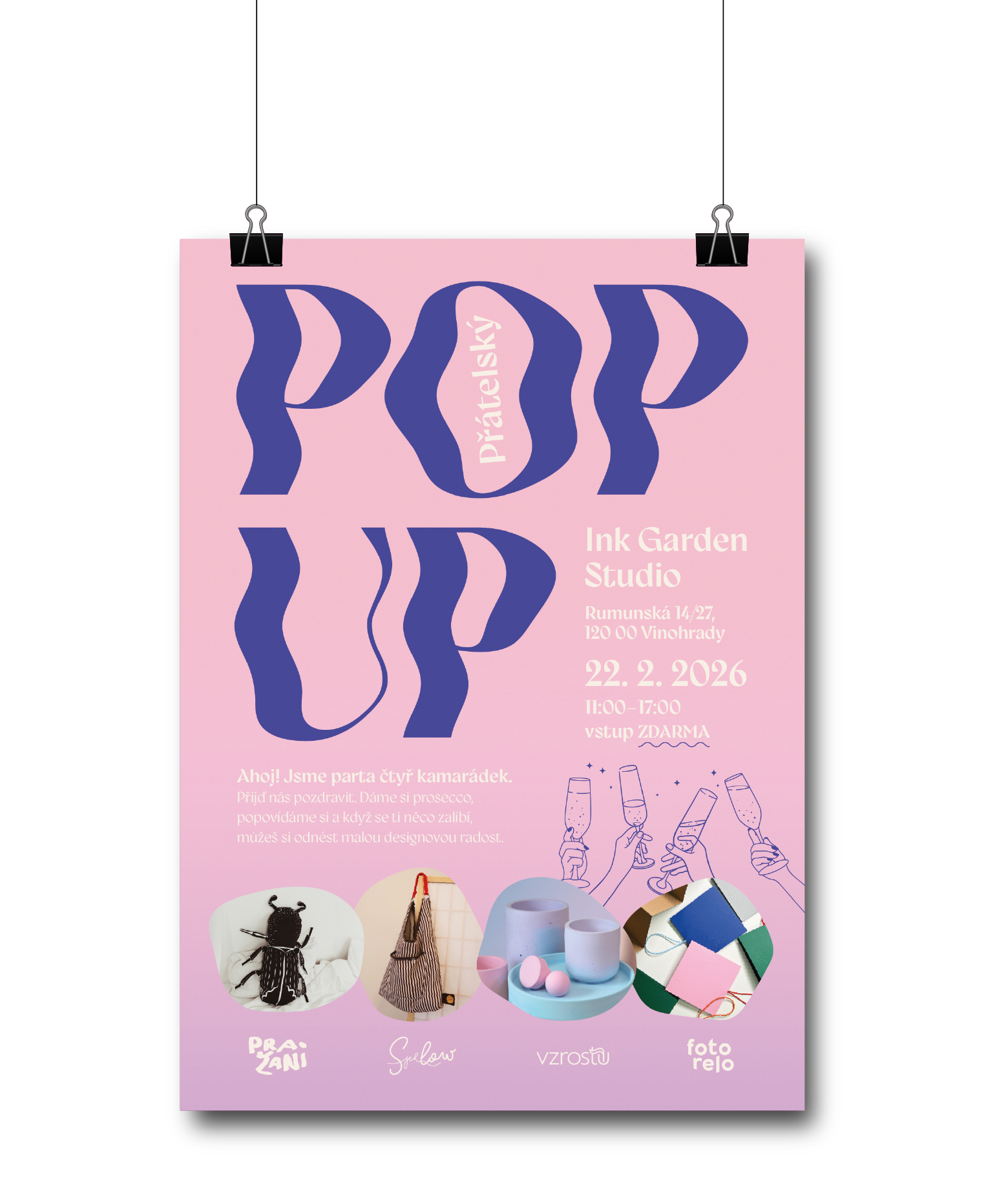 Tento plakát vznikl pro srdcový projekt – prodejní a setkávací akci čtyř kamarádek, které spojuje vášeň pro tvorbu. Cílem bylo vytvořit vizuál, který nepůsobí jako strohá reklama, ale jako pozvání na kávu a prosecco. Design odráží neformální atmosféru akce, kde je hlavním prvkem dialog mezi autorkami a návštěvníky. V rámci popupu jsem prezentovala i svůj vlastní brand Fotorelo, což mi umožnilo propojit roli grafické designérky a vystavovatelky v jeden autentický celek.
